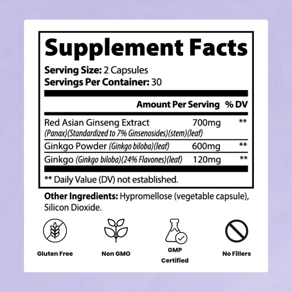 Our formula combines Ginseng root extract, Ginkgo Biloba leaf extract, Vitamin B6, and a clean plant-based capsule. No synthetic fillers, no stimulants, no added sugar, just natural clarity backed by science.